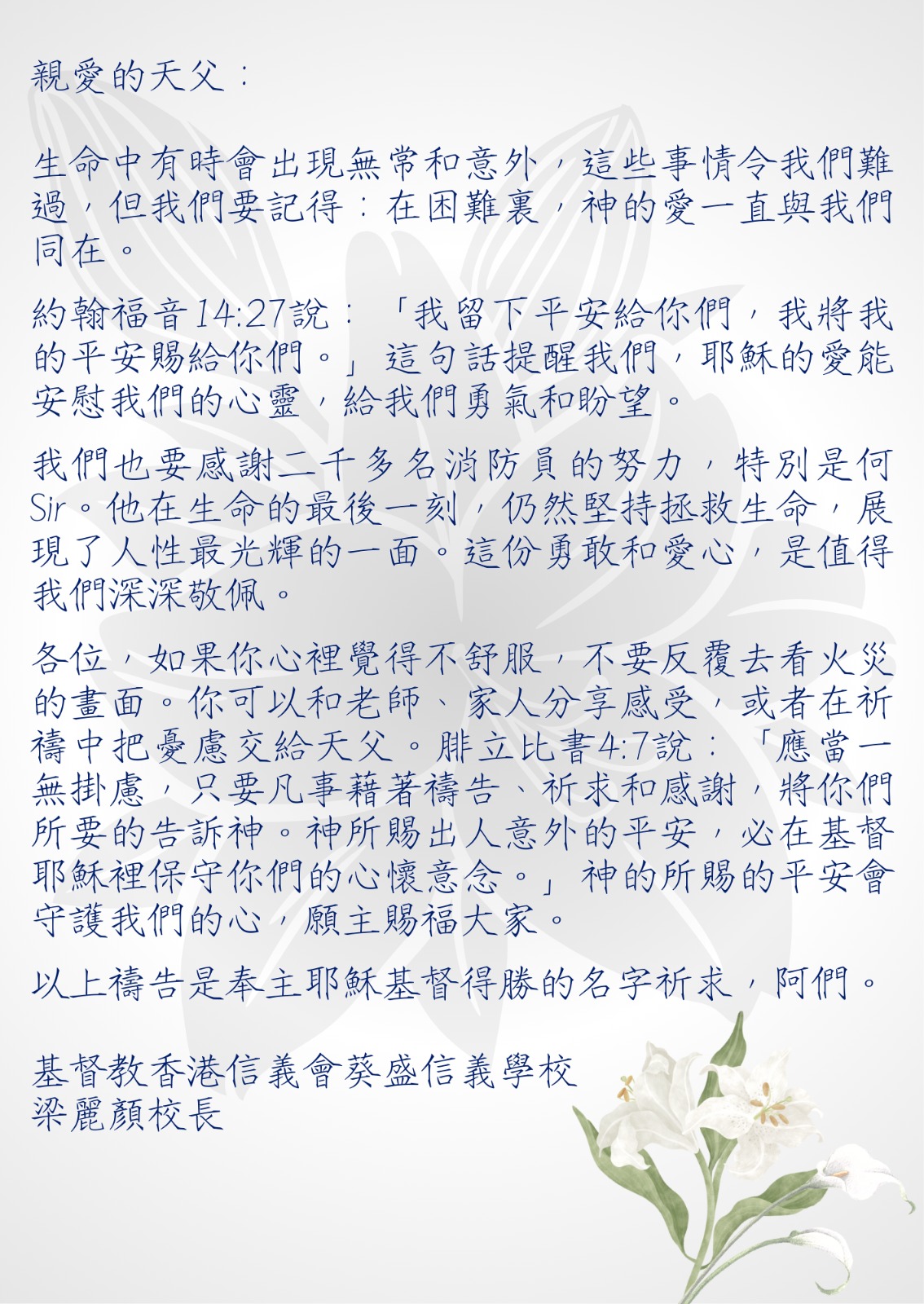 梁校長為大埔宏福苑火災禱告